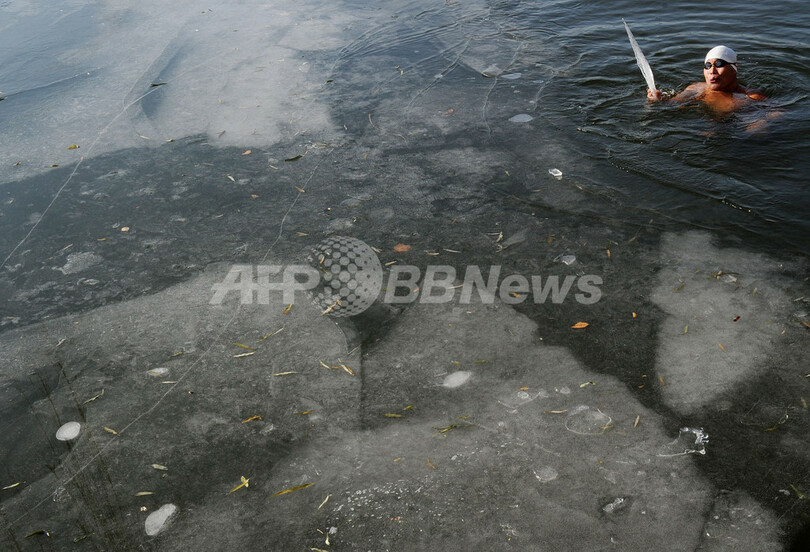写真は、北京(Beijing)市内の湖、后海(Houhai)で氷を除けながら寒中水泳する男性(2011年12月18日撮影)。(c)AFP/Mark RALSTON