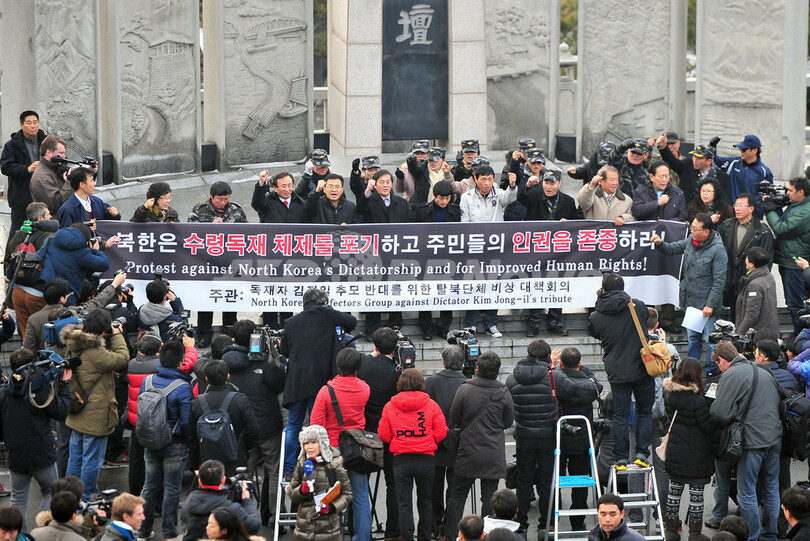 写真は、南北軍事境界線に近い韓国・坡州(Paju)の臨津閣(Imjingak)公園で、金総書記を批判し北朝鮮人民に「アラブの春」のような民衆蜂起を呼びかける脱北者ら(2011年12月21日撮影)。(c)AFP/JUNG YEON-JE