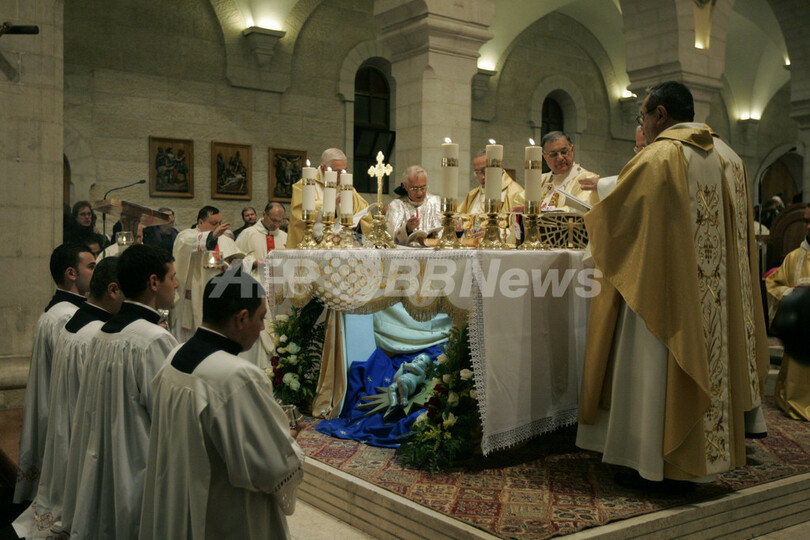 写真は、ベツレヘムの聖誕教会(Church of the Nativity)で行われた深夜ミサ(2011年12月25日撮影)。(c)AFP/Majdi Mohammed