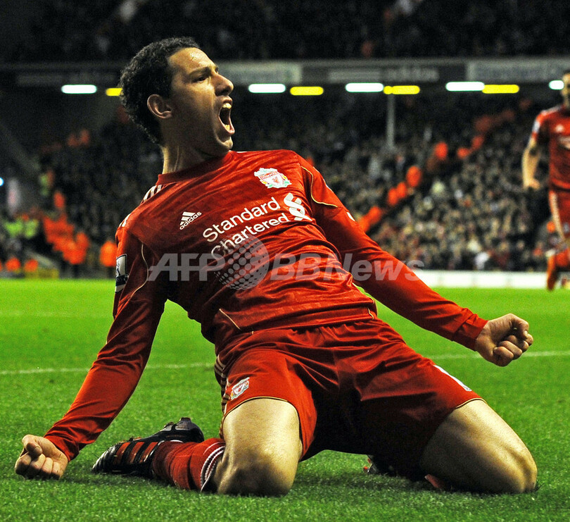 後半8分に同点ゴールを決めて歓喜するリバプールのマキシ・ロドリゲス(Maxi Rodriguez、2011年12月26日撮影)。(c)AFP/PAUL ELLIS