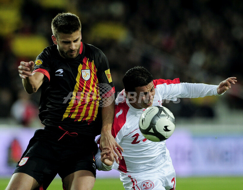 チュニジアのアミン・チェルミティ(Amine Chermiti、右)とボールを競るカタルーニャ選抜のジェラール・ピケ(Gerard Pique、2011年12月30日撮影)。(c)AFP/JOSEP LAGO