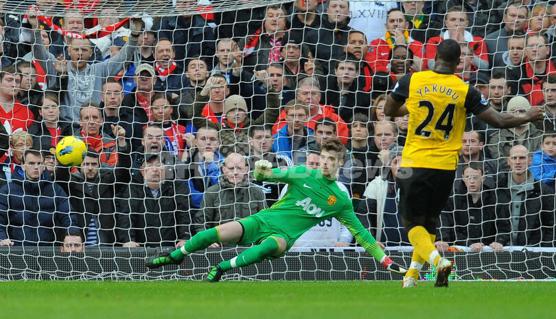 ブラックバーン・ローバーズのヤクブ・アイェグベニ(Yakubu Ayegbeni)に先制点を許すマンチェスター・ユナイテッドのGKダビド・デ・ヘア(David de Gea、2011年12月31日撮影)。(c)AFP/ANDREW YATES