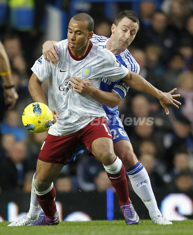チェルシーのジョン・テリー(John Terry)のマークを受けるアストン・ビラのガブリエル アグボンラホル(Gabriel Agbonlahor、2011年12月31日撮影)。(c)AFP/IAN KINGTON