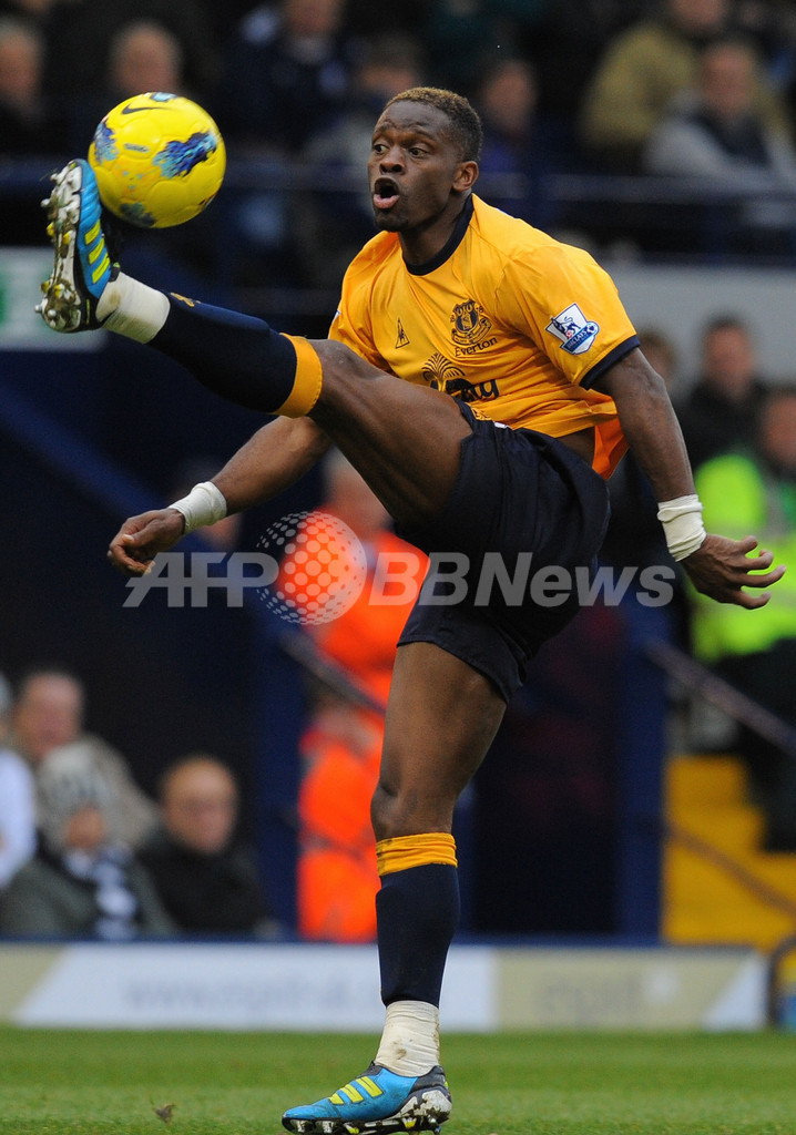 ボールをコントロールするエバートンのルイ・サハ(Louis Saha、2012年1月1日撮影)。(c)AFP/ANDREW YATES