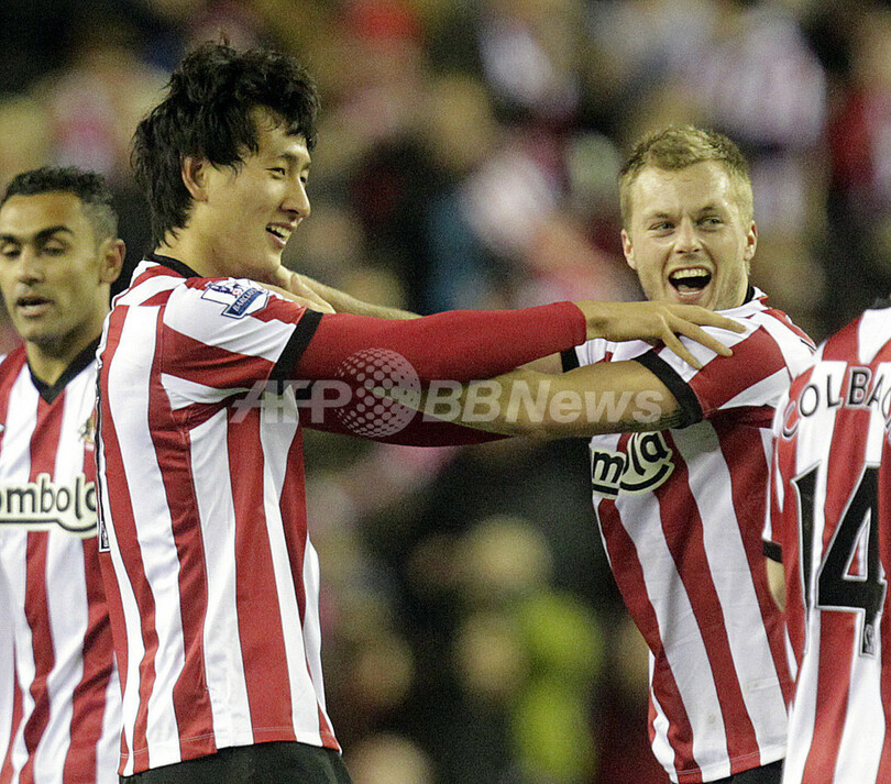 後半ロスタイムに決勝点を挙げ、セバスティアン・ラーション(Sebastian Larsson、右)と喜びを分かち合うサンダーランドの池東源(2012年1月1日撮影)。(c)AFP/GRAHAM STUART