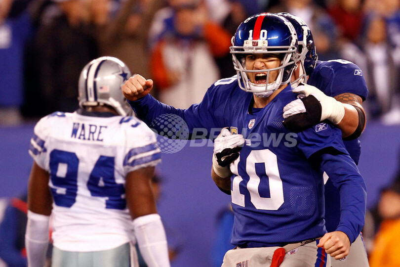 【1月2日 AFP】11NFLは1日、第17週の試合が各地で行われ、クォーターバック(QB)のイーライ・マニング(Eli Manning)が活躍を見せたニューヨーク・ジャイアンツ(New York Giants)が31-14でダラス・カウボーイズ(Dallas Cowboys)を破り、プレーオフ進出を決めた。