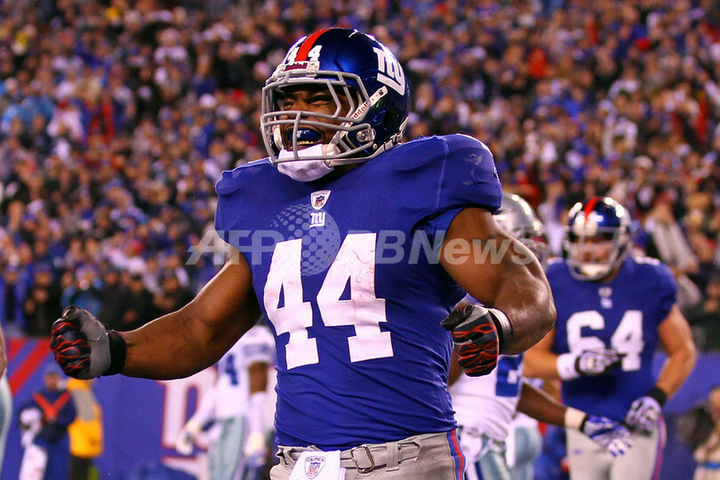 タッチダウンを決めて歓喜するジャイアンツのアーマッド・ブラッドショー(Ahmad Bradshaw、2012年1月1日撮影)。(c)AFP/Getty Images/Al Bello