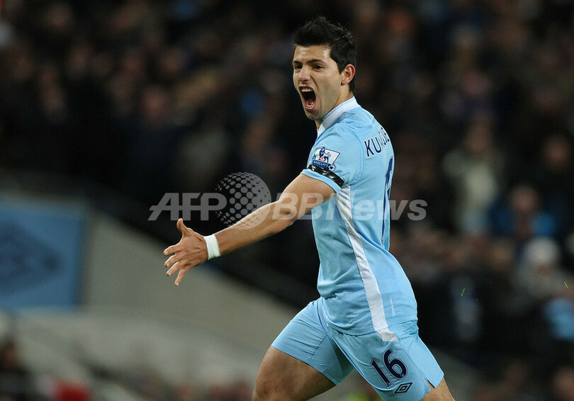 前半10分に先制ゴールを挙げ、喜ぶマンチェスター・シティのセルヒオ・アグエロ(Sergio Aguero、2012年1月3日撮影)。(c)AFP/PAUL ELLIS