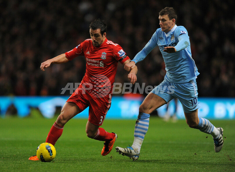 マンチェスター・シティのエディン・ジェコ(Edin Dzeko、右)のチェックを受けるリバプールのホセ・エンリケ(Jose Enrique、2012年1月3日撮影)。(c)AFP/ANDREW YATES