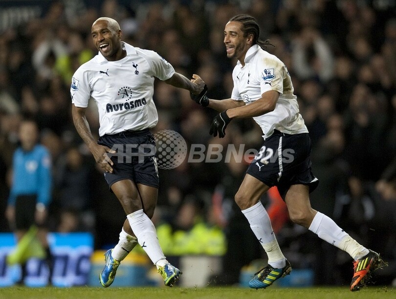 後半18分に先制ゴールを挙げ、喜ぶトッテナム・ホットスパーのジャーメイン・デフォー(Jermaine Defoe、左、2012年1月3日撮影)。(c)AFP/ADRIAN DENNIS