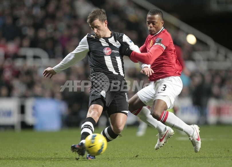 マンチェスター・ユナイテッドのパトリス・エヴラ(Patrice Evra、右)とボールを競るニューカッスルのライアン・テイラー(Ryan Taylor、2012年1月4日撮影)。(c)AFP/GRAHAM STUART