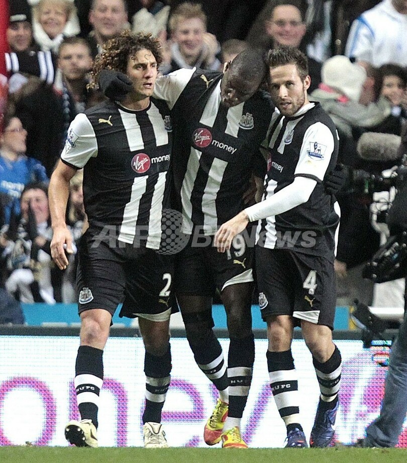 前半33分に先制点を奪い、チームメイトのファブリシオ・コロッチーニ(Fabricio Coloccini、左)、ヨハン・カバイェ(Yohan Cabaye、右)と歓喜するニューカッスルのデンバ・バ(Demba Ba、2012年1月4日撮影)。(c)AFP/GRAHAM STUART