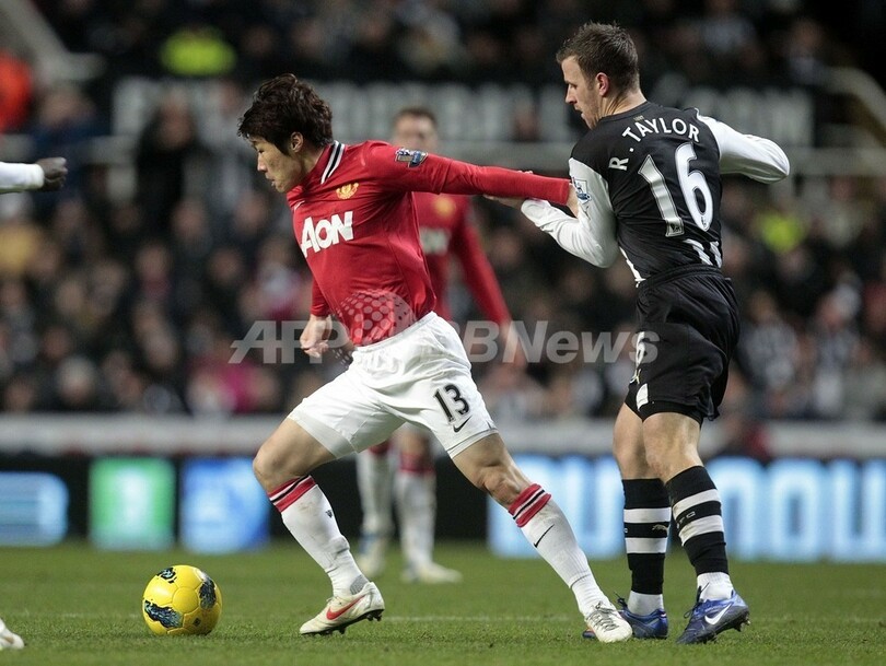 ニューカッスルのライアン・テイラー(Ryan Taylor、右)とボールを競るマンチェスター・ユナイテッドの朴智星(Park Ji-sung、パク・チソン、2012年1月4日撮影)。(c)AFP/GRAHAM STUART