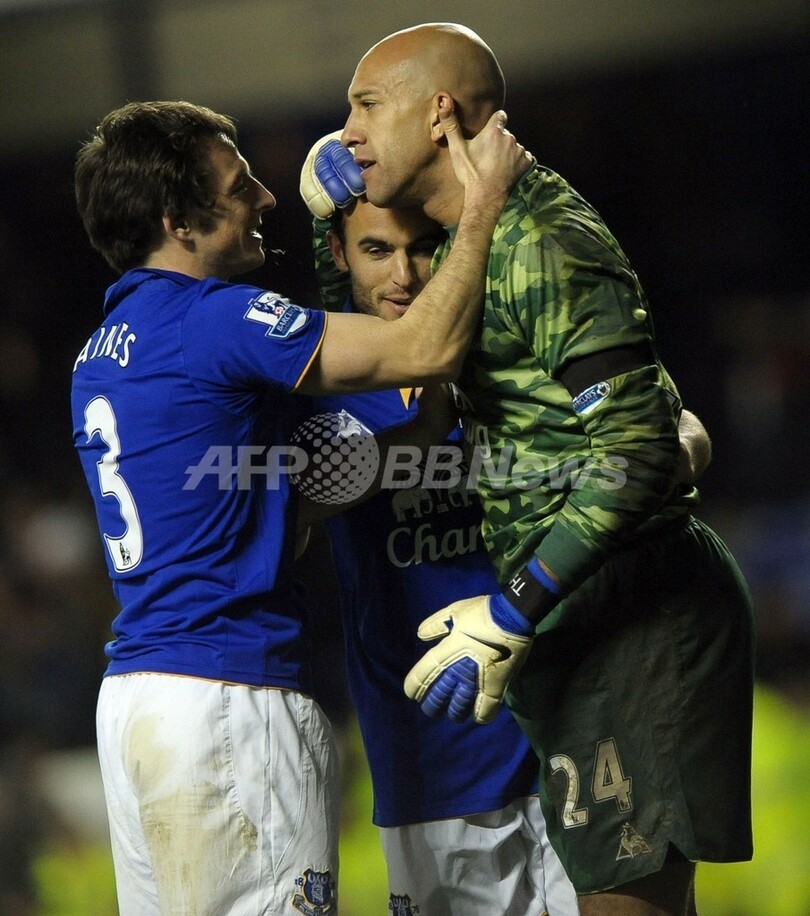 後半18分に先制点を挙げ、レイトン・ベインズ(Leighton Baines、左)と歓喜するエバートンのGKティム・ハワード(Tim Howard、2012年1月4日撮影)。(c)AFP/PAUL ELLIS