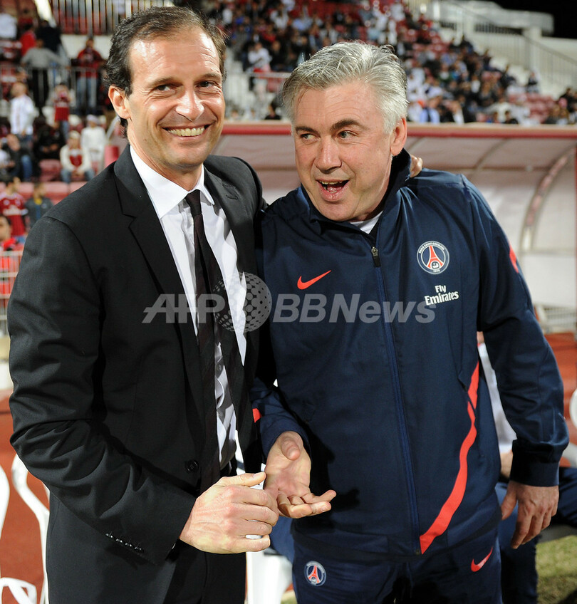 試合前に言葉を交わすパリ・サンジェルマンのカルロ・アンチェロッティ監督(Carlo Ancelotti、右)とACミランのマッシミリアーノ・アレグリ監督(Massimiliano Allegri、2012年1月4日撮影)。(c)AFP/FRANCK FIFE