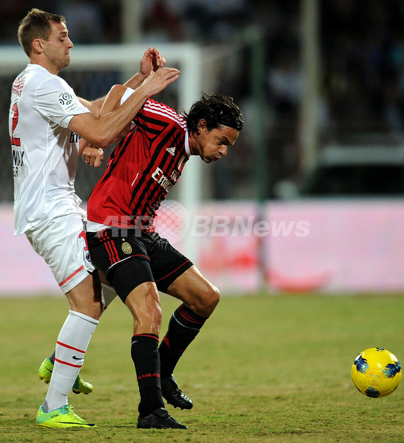 パリ・サンジェルマンのマヒュー・ボドメル(Mathieu Bodmer、左)とボールを競るACミランのフィリッポ・インザーギ(Filippo Inzaghi、2012年1月4日撮影)。(c)AFP/FRANCK FIFE