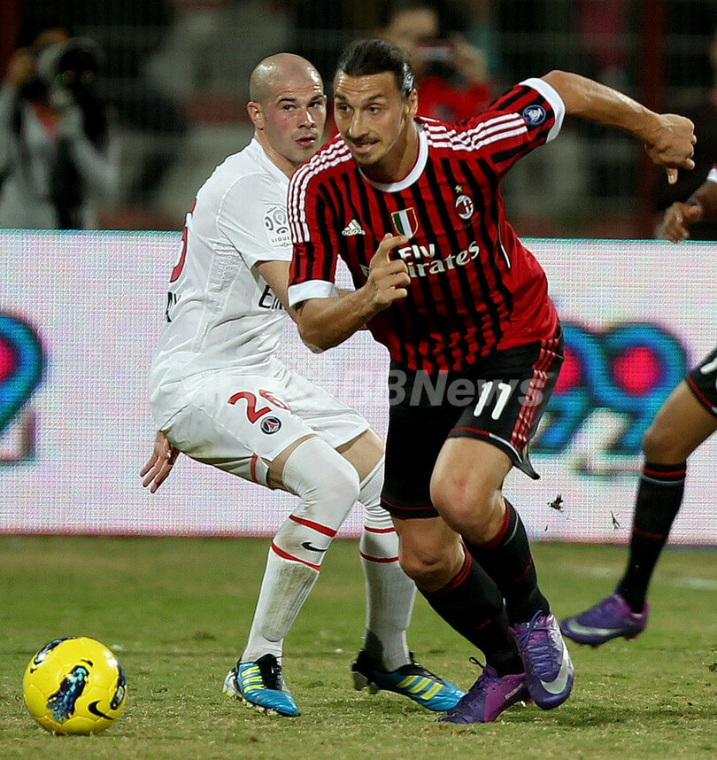 パリ・サンジェルマンのクリストフ・ジャレ(Christophe Jallet、左)とボールを競るACミランのズラタン・イブラヒモビッチ(Zlatan Ibrahimovic、2012年1月4日撮影)。(c)AFP/MARWAN NAAMANI