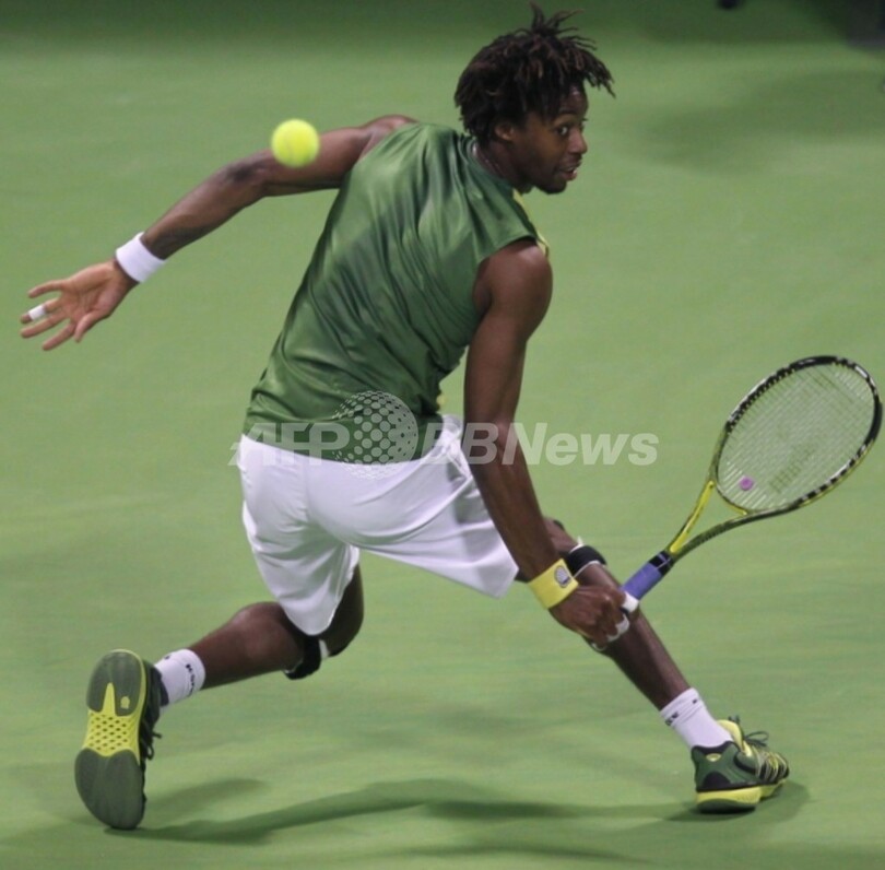 リターンを打つガエル・モンフィス(2012年1月5日撮影)。(c)AFP/KARIM JAAFAR