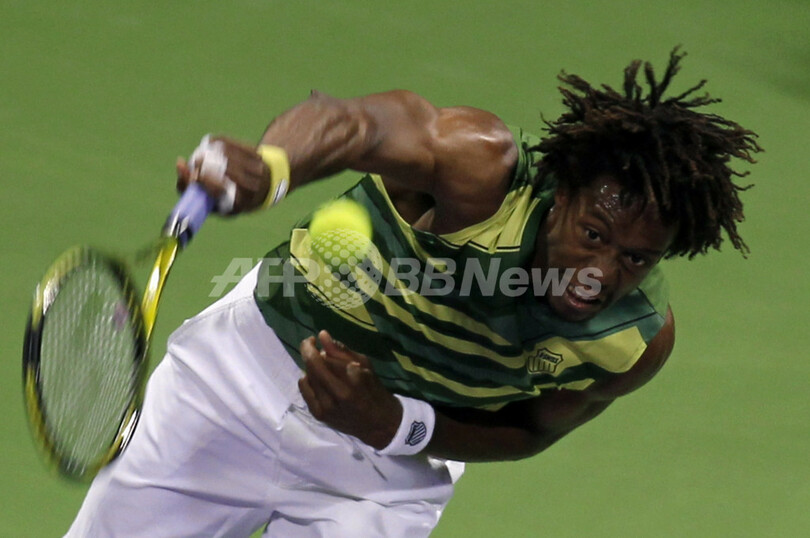 リターンを打つガエル・モンフィス(2012年1月5日撮影)。(c)AFP/KARIM JAAFAR