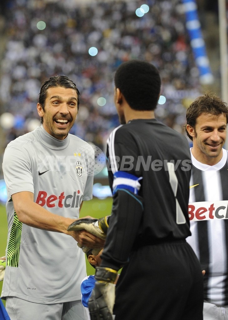 アル・ヒラルのGKモハメド・アル・デアイエ氏(Mohammed al-Deayea、手前)と握手を交わすユベントスのGKジャンルイジ・ブッフォン(Gianluigi Buffon、左、2012年1月5日撮影)。(c)AFP/FAYEZ NURELDINE