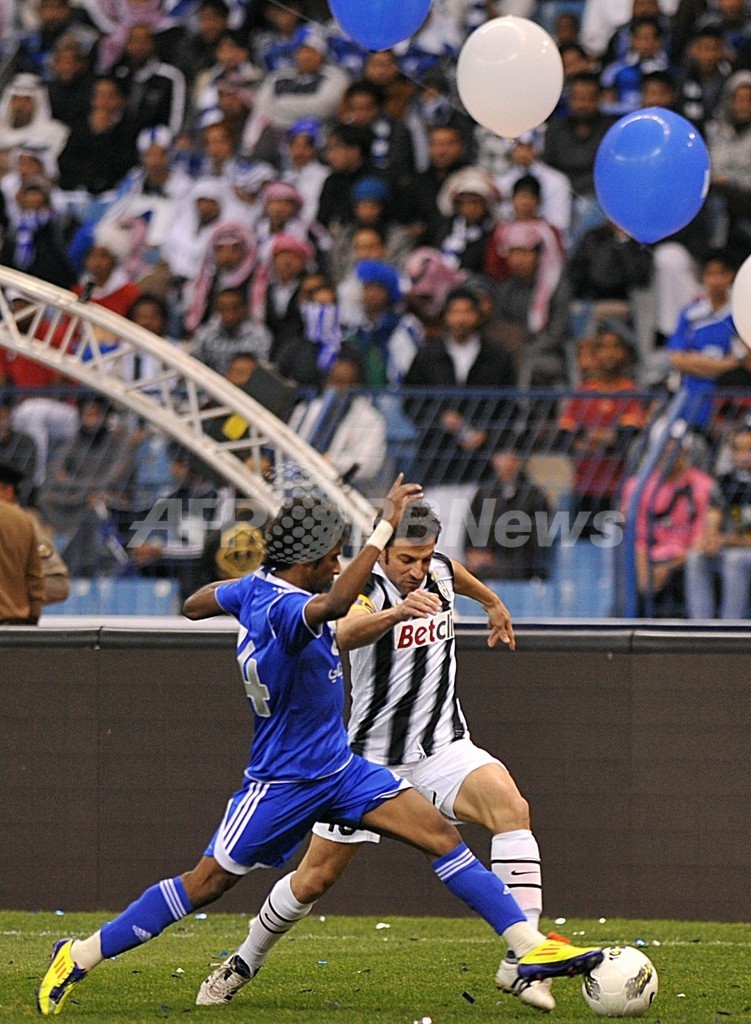 アル・ヒラルの選手とボールを競るユベントスのアレッサンドロ・デルピエロ(Alessandro del Piero、右、2012年1月5日撮影)。(c)AFP/FAYEZ NURELDINE