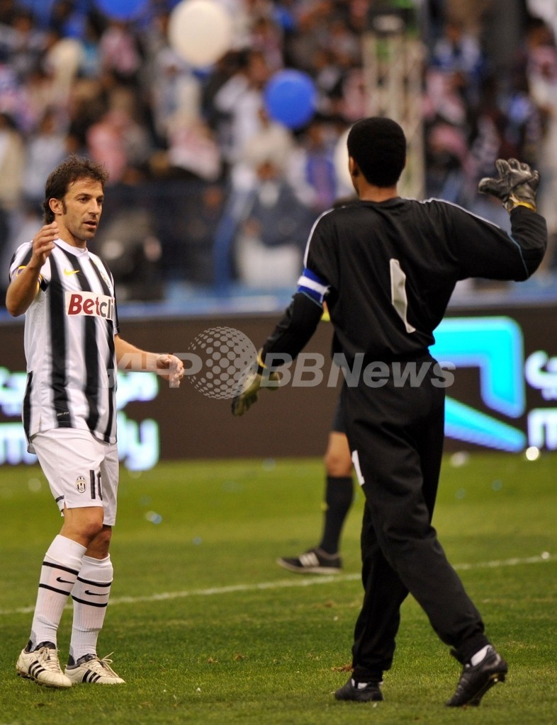 ユベントスのアレッサンドロ・デルピエロ(Alessandro del Piero、左)の元に歩み寄るアル・ヒラルのGKモハメド・アル・デアイエ氏(2012年1月5日撮影)。(c)AFP/FAYEZ NURELDINE