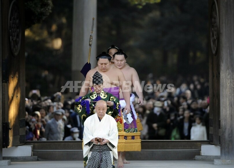 ニュース ライフ 白鵬が明治神宮で奉納土俵入り、新年恒例 2012年1月6日 19:14 発信地:千葉 [ アジア・オセアニア 千葉 ] このニュースをシェア ‹ › ❮ 2/7 ❯ 都内の明治神宮で6日、大相撲の横綱白鵬(Hakuho)が新年恒例の奉納土俵入りを行った。写真は、奉納土俵入りに向かう白鵬と太刀持ちの安美錦(Aminishiki)、露払いの旭天鵬(Kyokutenho)ら(2012年1月6日撮影)。(c)AFP/TOSHIFUMI KITAMURA 画像作成中 ! 【1月6日 AFP】都内の明治神宮で6日、大相撲の横綱白鵬(Hakuho)が新年恒例の奉納土俵入りを行った。(c)AFP ライフ 一覧へ> メディア・報道関係・法人の方向け 写真・動画 購入のお問合せ>
