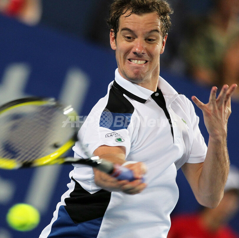 リターンを打つフランスのリシャール・ガスケ(Richard Gasquet、2012年1月7日撮影)。(c)AFP/Tony ASHBY