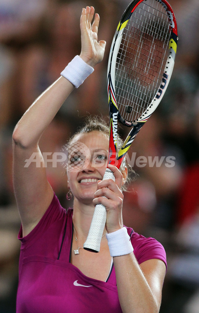 試合に勝利し歓声に応えるチェコのペトラ・クヴィトバ(Petra Kvitova、2012年1月7日撮影)。(c)AFP/Tony ASHBY