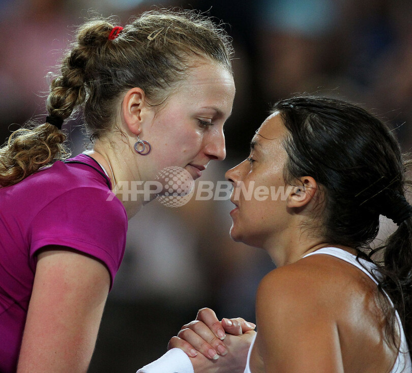試合後、フランスのマリオン・バルトリ(Marion Bartoli、右)と握手を交わすチェコのペトラ・クヴィトバ(Petra Kvitova、2012年1月7日撮影)。(c)AFP/Tony ASHBY