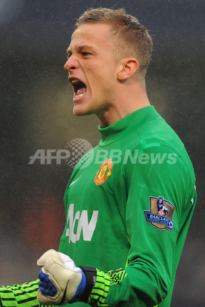 前半40分にウェイン・ルーニー(Wayne Rooney)が決めたチーム3得点目に歓喜するマンチェスター・ユナイテッドのアンデルス・リンデゴーア(Anders Lindegaard、2012年1月8日撮影)。(c)AFP/PAUL ELLIS