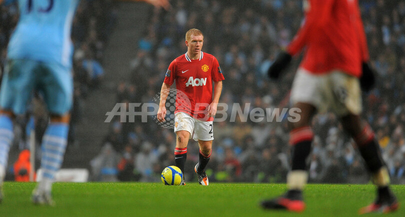 ボールをキープするマンチェスター・ユナイテッドのポール・スコールズ(2012年1月8日撮影)。(c)AFP/PAUL ELLIS