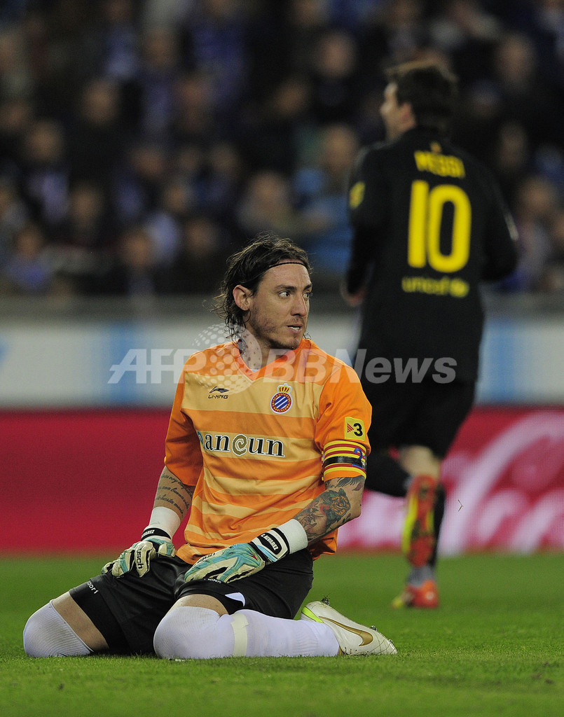 前半16分にFCバルセロナのセスク・ファブレガス(Cesc Fabregas)に先制点を許し落胆するRCDエスパニョールのクリスティアン・アルバレス(Cristian Alvarez、2012年1月8日撮影)。(c)AFP/JOSEP LAGO