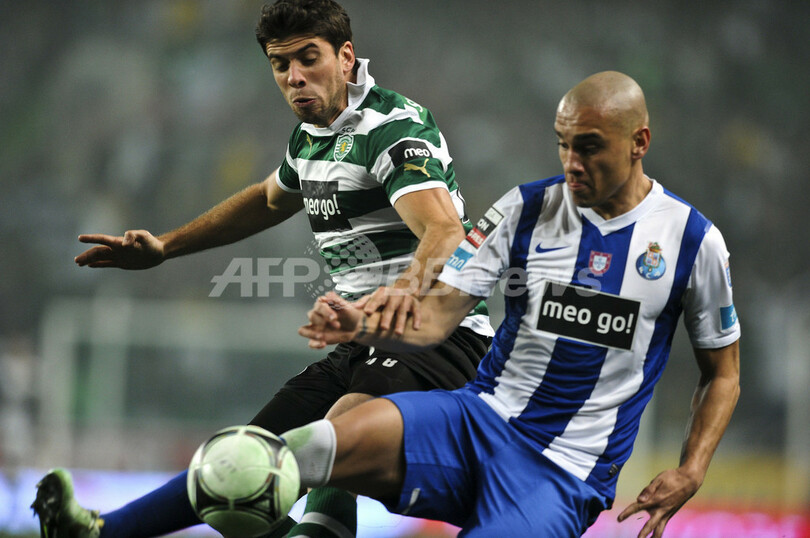 ボールを競るスポルティング・リスボンのエミリアーノ・インスア(Emiliano Insua)とFCポルトのマイコン(Maicon Pereira Roque、2012年1月7日撮影)。(c)AFP/PATRICIA DE MELO MOREIRA