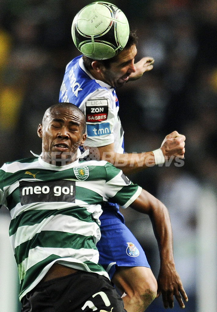 FCポルトのジョアン・モウティーニョ(Joao Moutinho)とボールを競るスポルティング・リスボンのエリアス(Elias Trindade、2012年1月7日撮影)。(c)AFP/PATRICIA DE MELO MOREIRA