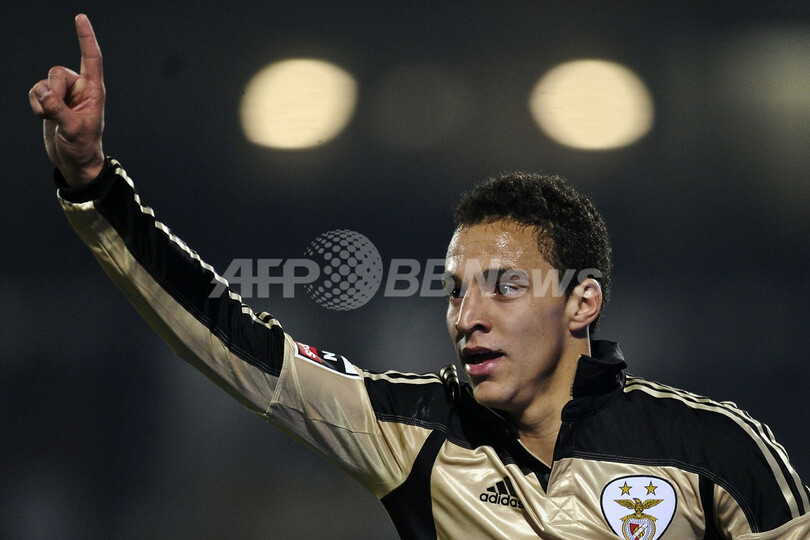 得点を挙げて歓喜するベンフィカのロドリゴ(Rodrigo Moreno Machado、2012年1月8日撮影)。(c)AFP/PATRICIA DE MELO MOREIRA