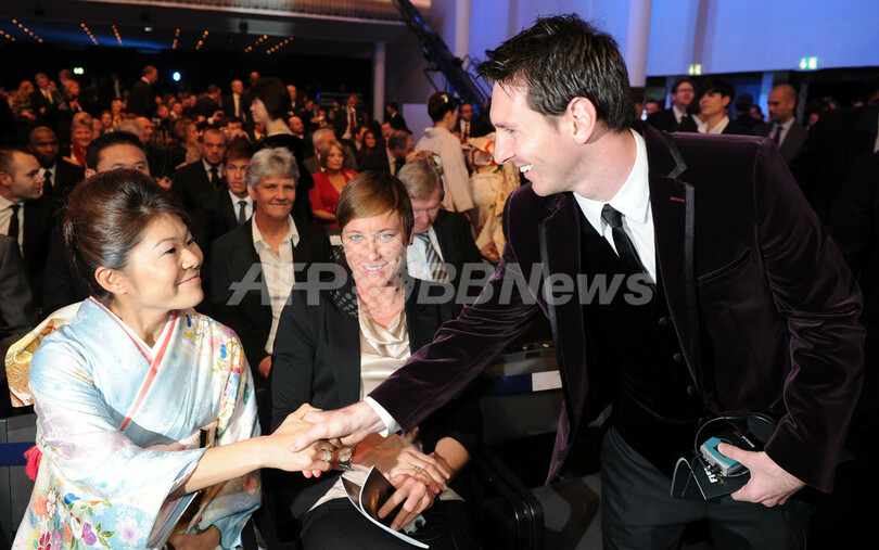 表彰式開始前にリオネル・メッシ(Lionel Messi、右)と握手を交す澤穂希(2012年1月9日撮影)。(c)AFP/FRANCK FIFE