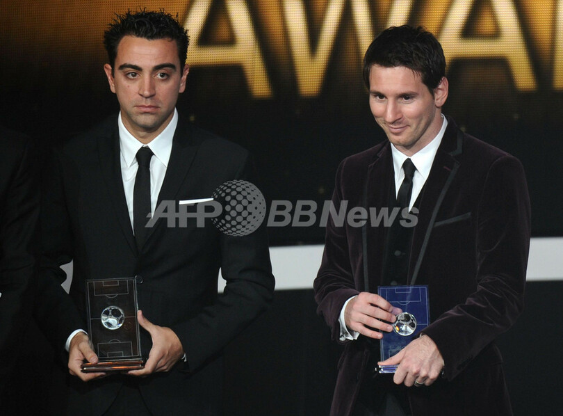 表彰式に臨むシャビ・エルナンデス(Xavi Hernandez、左)とリオネル・メッシ(2012年1月9日撮影)。(c)AFP/FABRICE COFFRINI