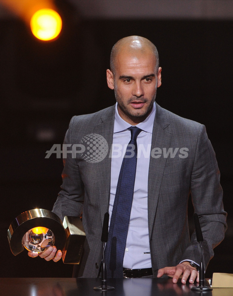 FIFA年間最優秀監督(FIFA World Coach of the Year)に選出され、表彰式に臨むFCバルセロナ(FC Barcelona)のジョゼップ・グアルディオラ(Josep Guardiola)監督(2012年1月9日撮影)。(c)AFP/FRANCK FIFE