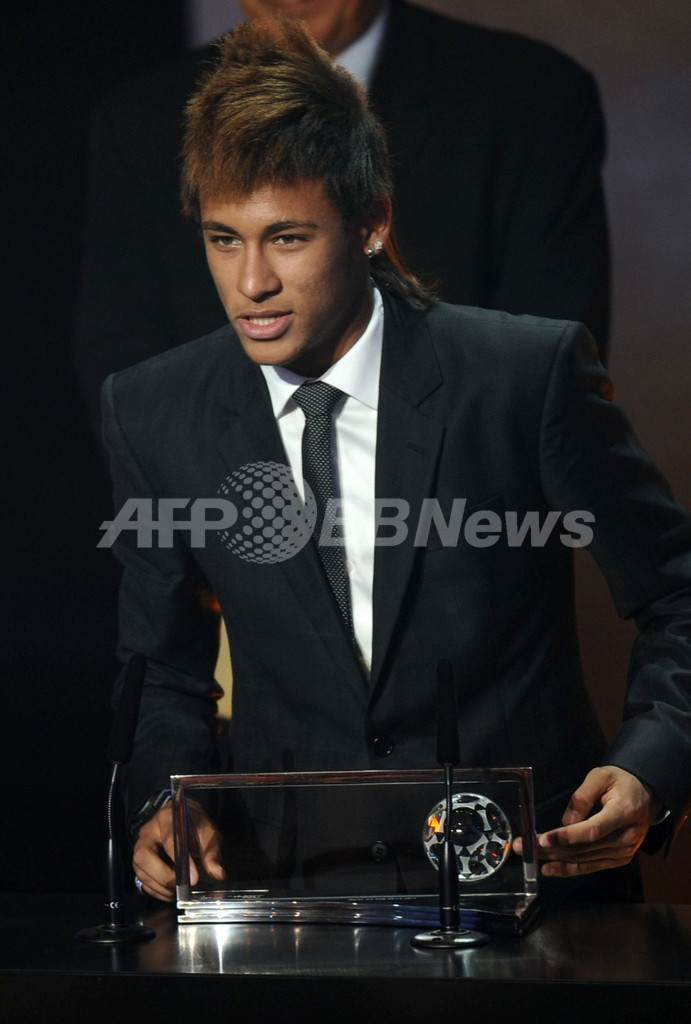 年間最優秀ゴール「FIFAプスカシュ賞(FIFA's Ferenc Puskas Award)」を受賞し、表彰式でスピーチを行うブラジル1部リーグのサントスFC(Santos FC)のネイマール(Neymar da Silva Santos Junior、2012年1月9日撮影)。(c)AFP/FABRICE COFFRINI