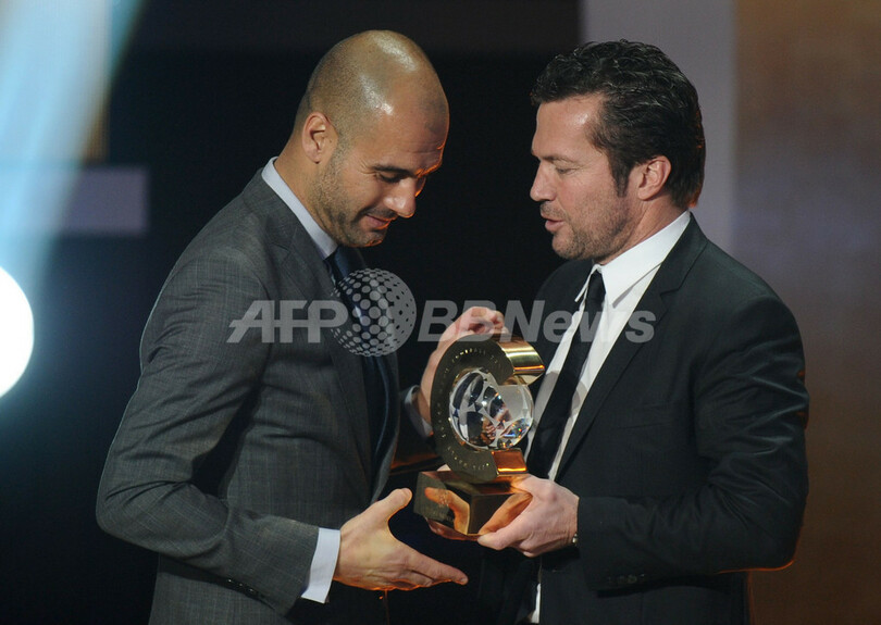 FIFA年間最優秀監督(FIFA World Coach of the Year)に選出され、表彰式で元ドイツ代表のローター・マテウス(Lothar Matthaeus)氏からトロフィーを受け取るFCバルセロナ(FC Barcelona)のジョゼップ・グアルディオラ(Josep Guardiola)監督(2012年1月9日撮影)。(c)AFP/FABRICE COFFRINI