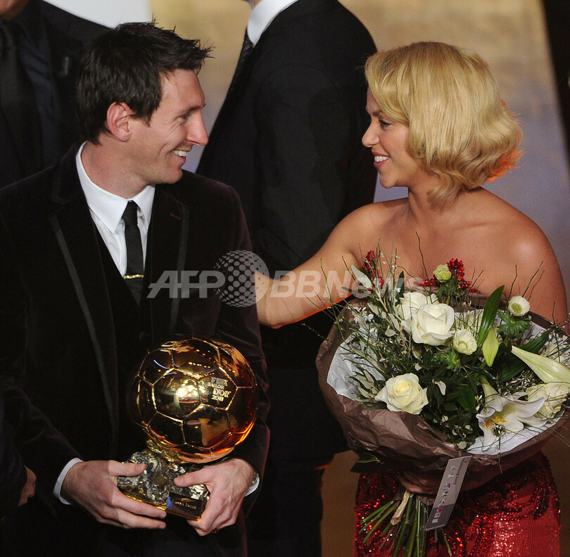 表彰式でコロンビア出身の歌手シャキーラ(Shakira)と談笑するリオネル・メッシ(2012年1月9日撮影)。(c)AFP/FRANCK FIFE