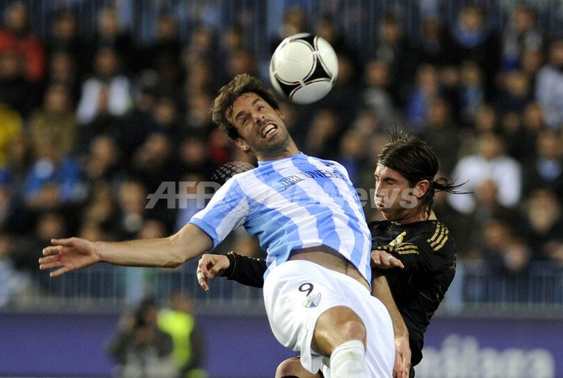 レアル・マドリードのセルヒオ・ラモス(Sergio Ramos)とボールを競るマラガのルート・ファン・ニステルローイ(Ruud Van Nistelrooy、2012年1月10日撮影)。(c)AFP/Jorge Guerrero