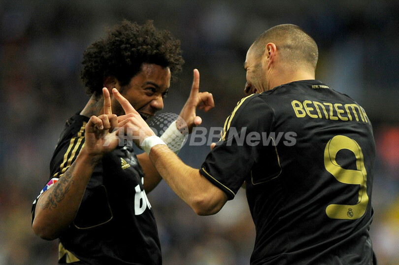 後半27分に先制点を挙げたカリム・ベンゼマ(Karim Benzema)を祝福するレアル・マドリードのマルセロ(Marcelo Vieira Da Silva Junior、2012年1月10日撮影)。(c)AFP/CRISTINA QUICLER