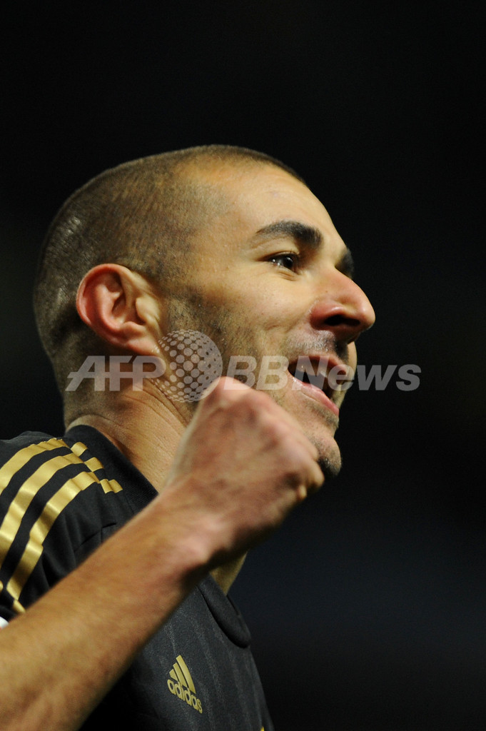 後半27分に先制点を挙げて歓喜するレアル・マドリードのカリム・ベンゼマ(Karim Benzema、2012年1月10日撮影)。(c)AFP/Jorge Guerrero