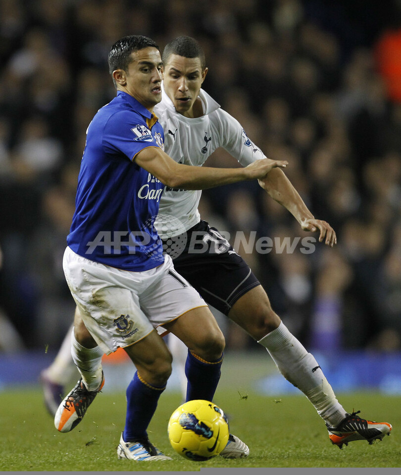 トッテナム・ホットスパーのジェイク・リヴァーモア(Jake Livermore)のチェックを受けるエバートンのティム・カヒル(Tim Cahill、2012年1月11日撮影)。(c)AFP/IAN KINGTON