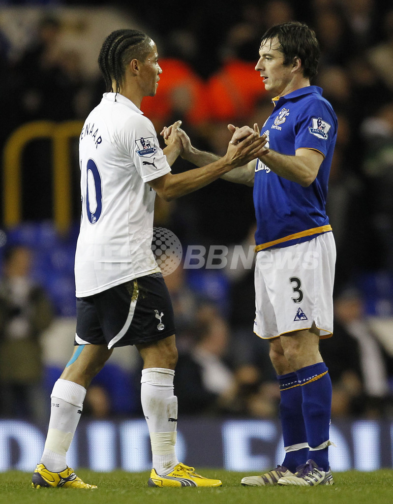 試合後、お互いの健闘を称えあうトッテナム・ホットスパーのベノワ・アス・エコット(Benoit Assou-Ekotto)とエバートンのレイトン・ベインズ(Leighton Baines、2012年1月11日撮影)。(c)AFP/IAN KINGTON