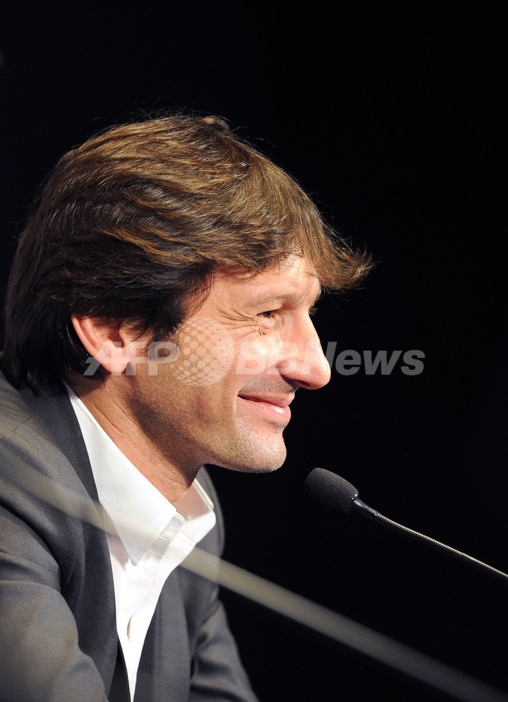 記者会見で笑顔を見せるパリ・サンジェルマンのスポーツ・ディレクターを務めるレオナルド氏(Leonardo Nascimento de Araujo、2012年1月12日撮影)。(c)AFP/FRANCK FIFE