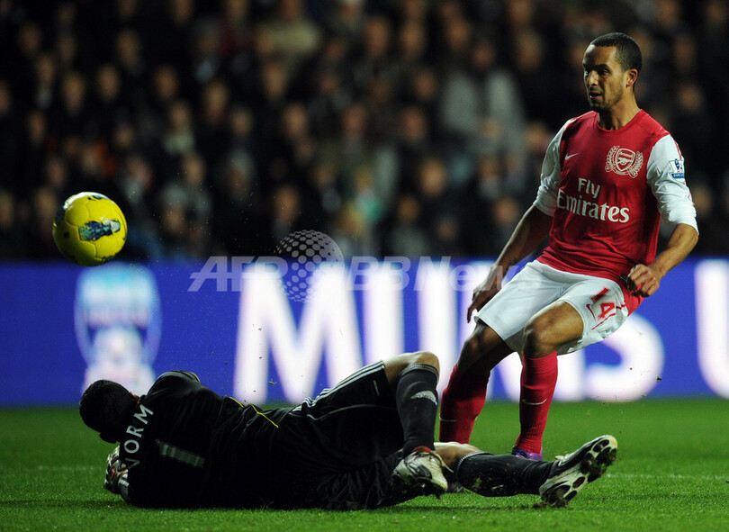 後半24分に同点ゴールを挙げるアーセナルのテオ・ウォルコット(Theo Walcott、右、2012年1月15日撮影)。(c)AFP/ADRIAN DENNIS
