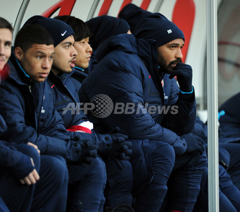 ベンチから試合を見守るアーセナルのティエリ・アンリ(Thierry Henry、右、2012年1月15日撮影)。(c)AFP/ADRIAN DENNIS